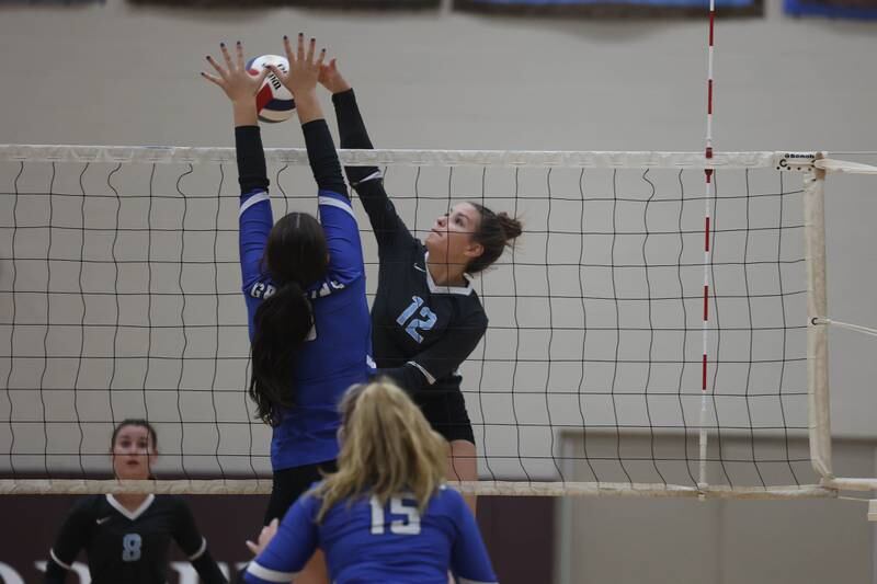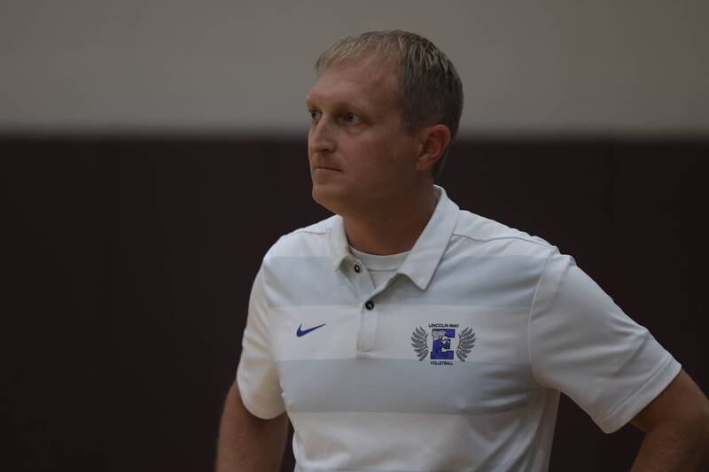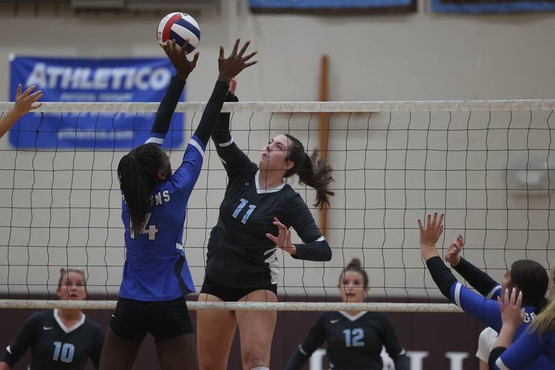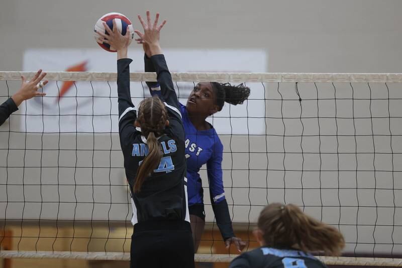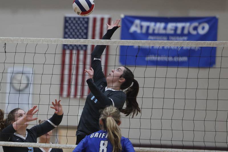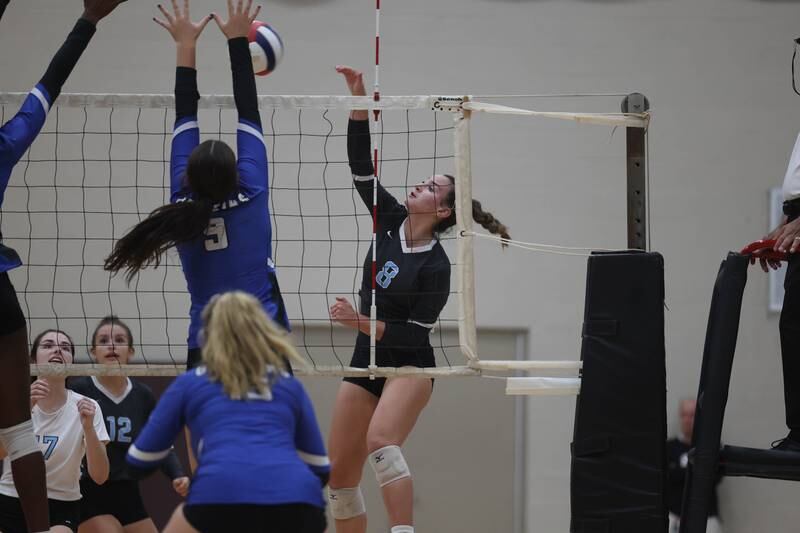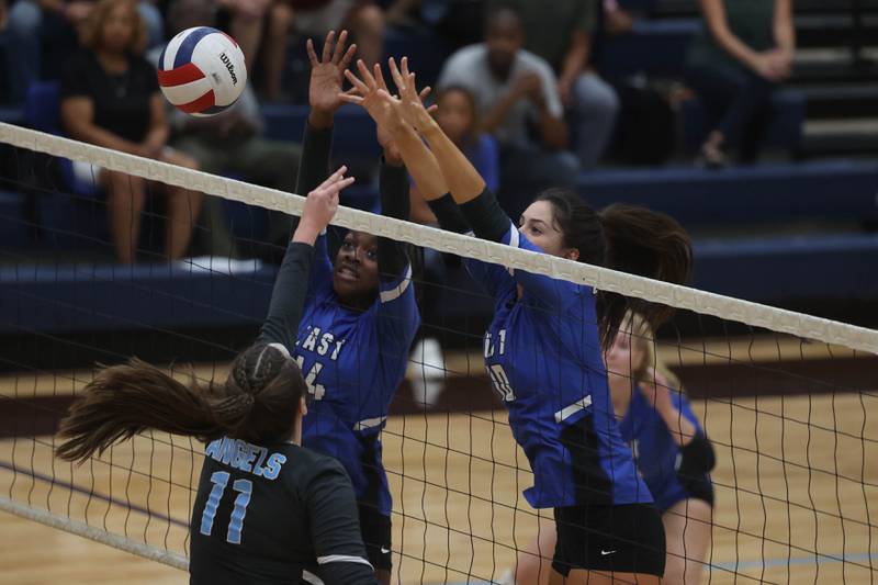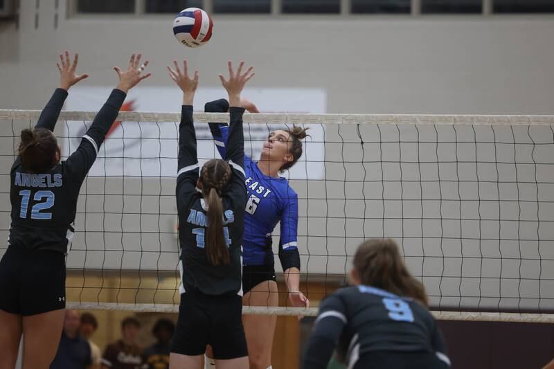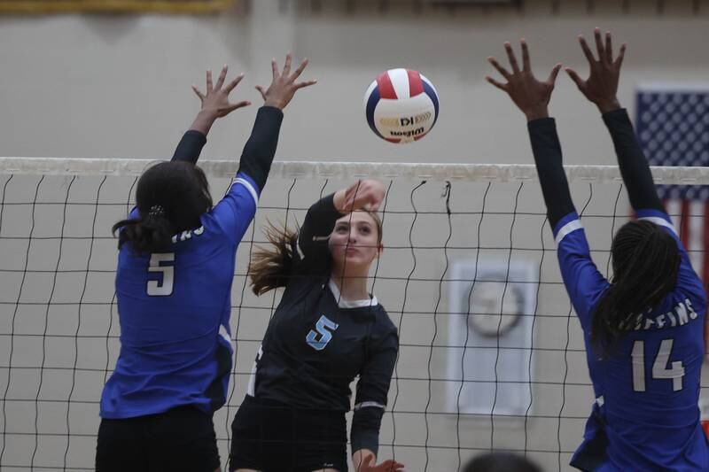 Lincoln-Way East’s Lexi Byas dives for the dig against Joliet Catholic. Monday, Sept. 19, 2022, in Joliet. (Gary Middendorf - gmiddendorf@shawmedia.com/Gary Middendorf)