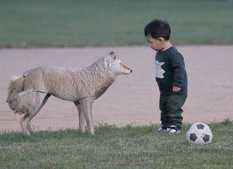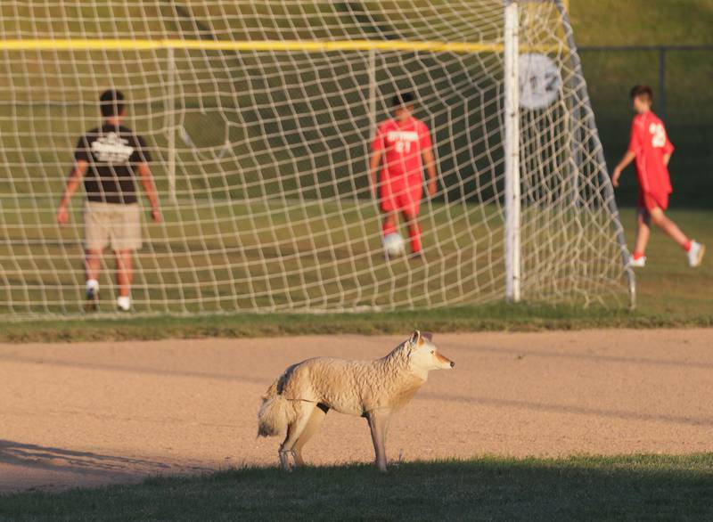 Diego Nanez, 1, of Peru, stares at a fake coyote on the baseball diamond at Ottawa High School during the soccer game between L-P and Ottawa on Monday, Oct. 3, 2022. The decoy was placed by the school to scare geese from coming onto the field. (Scott Anderson - sanderson@shawmedia.com)