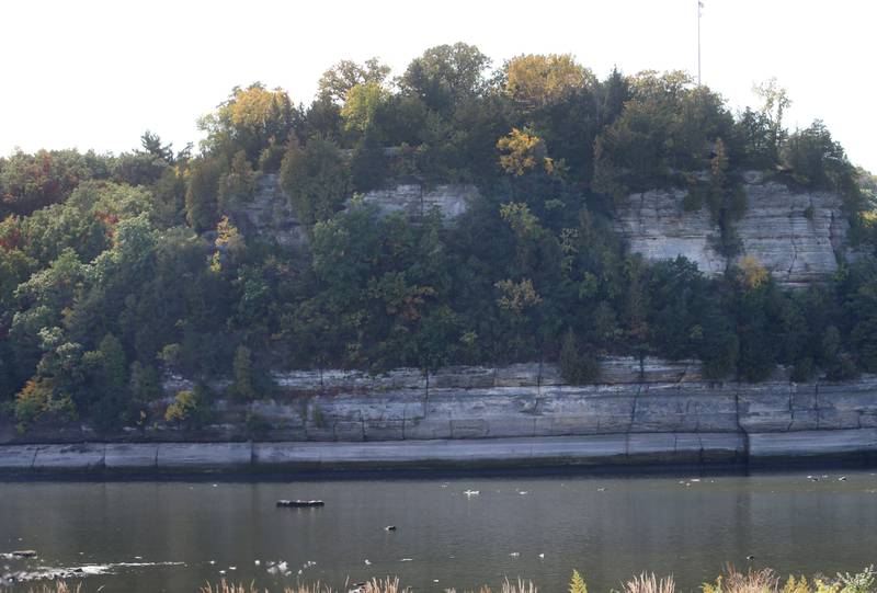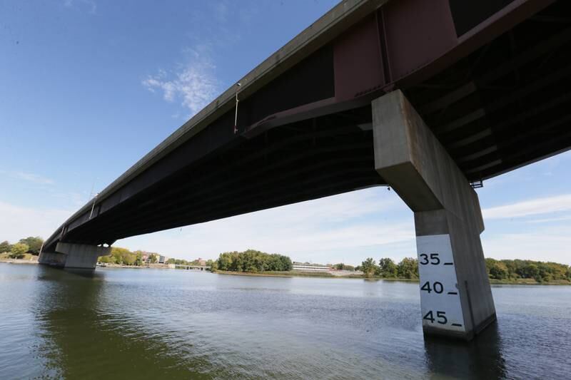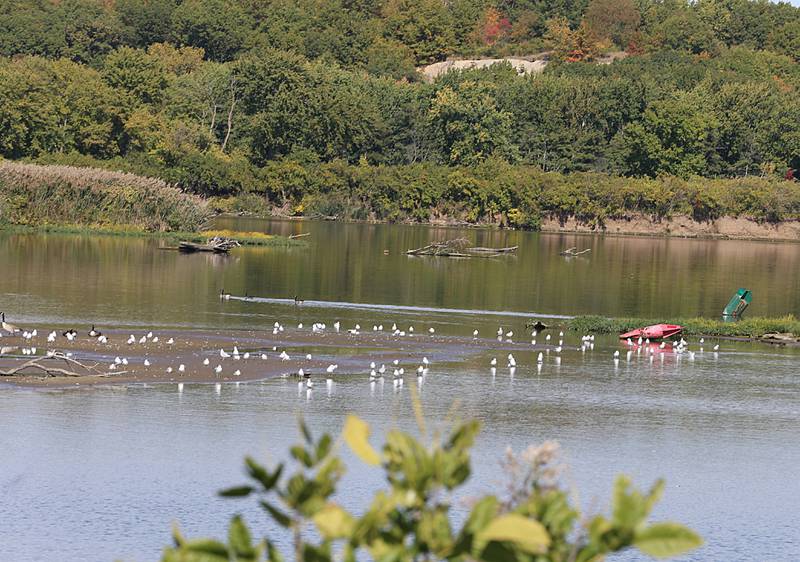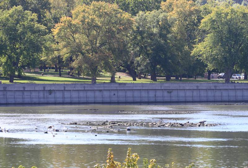 Jim Small, of Lemont, fishes in the center of the channel Wednesday, Oct. 5, 2022, near Plum Island at Starved Rock State Park. The Illinois River is inches away from an all-time record low. The river level at the Starved Rock Lock and Dam is 440.09 feet above sea level and the record low is 439.9 set on Oct. 3, 2012. (Scott Anderson)