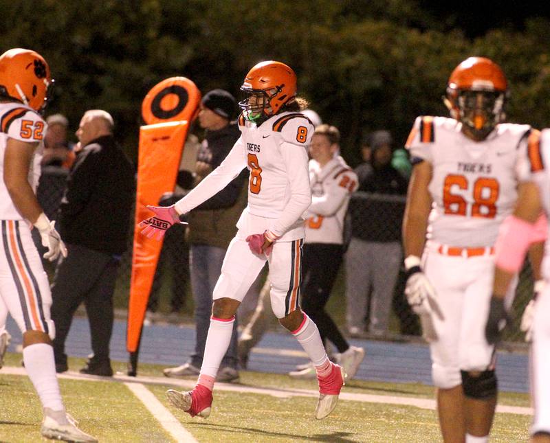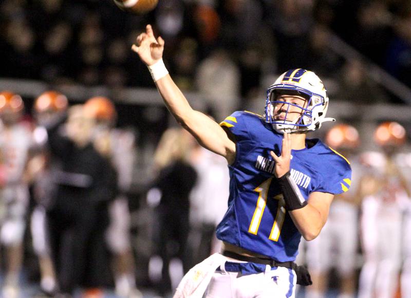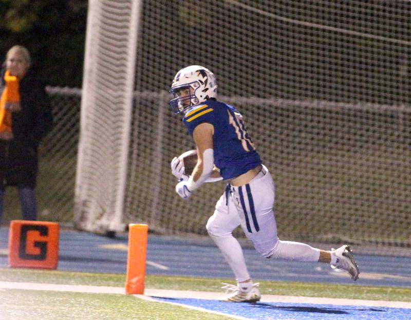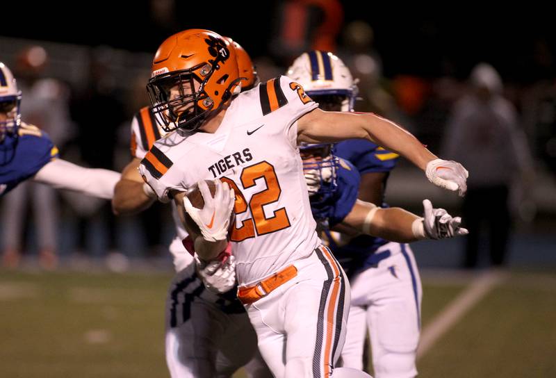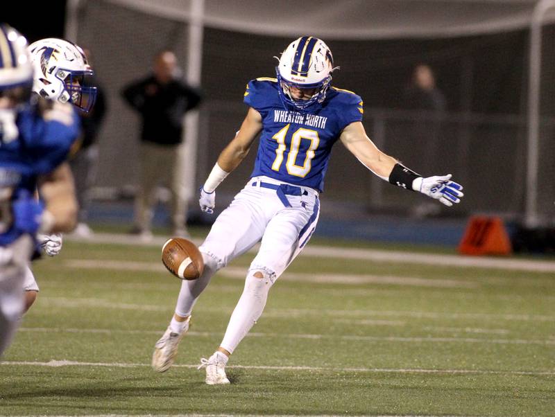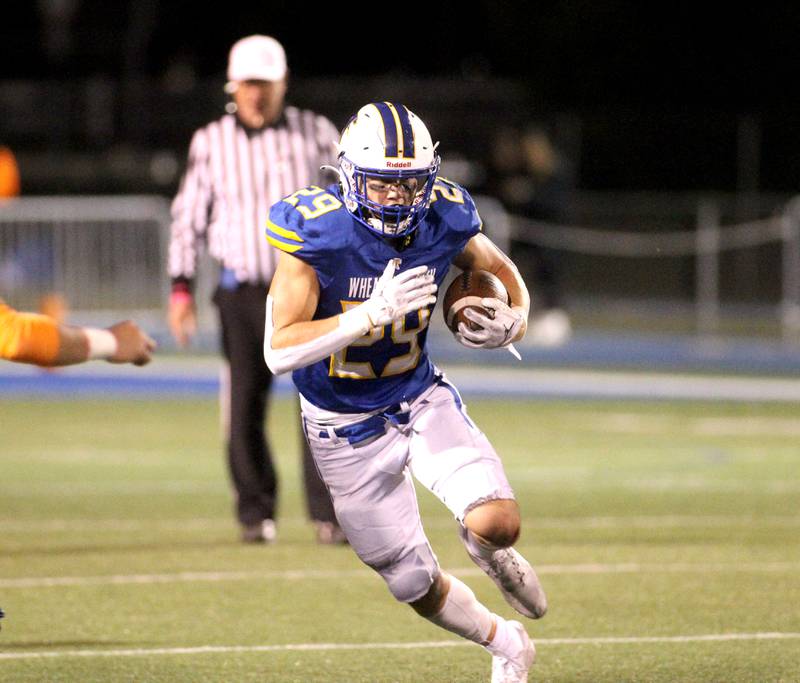 Wheaton North’s Karsten Libby carries the ball before a tackle by Wheaton Warrenville South’s Hunter Almada during a game at Wheaton North on Friday, Oct. 7, 2022. (Sandy Bressner – sbressner@shawmedia.comDeborah Giampapa)