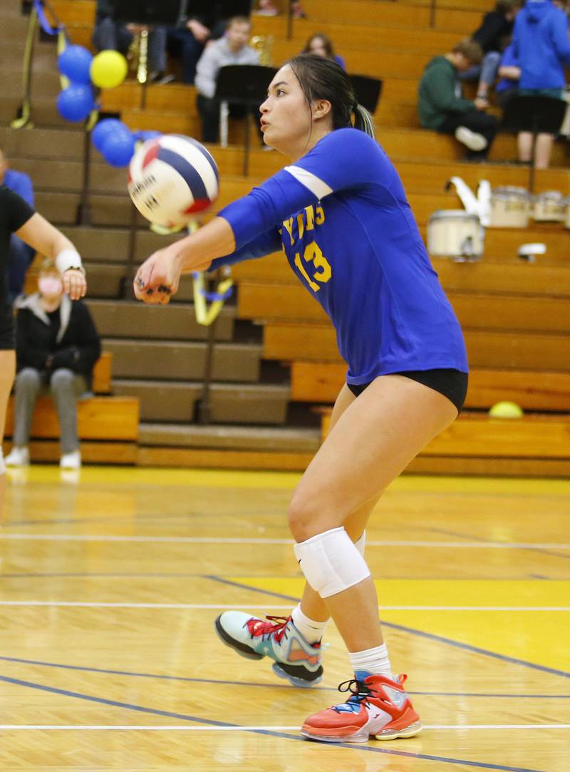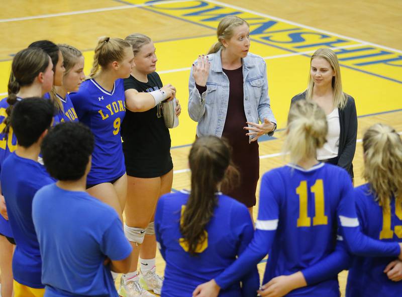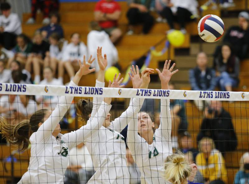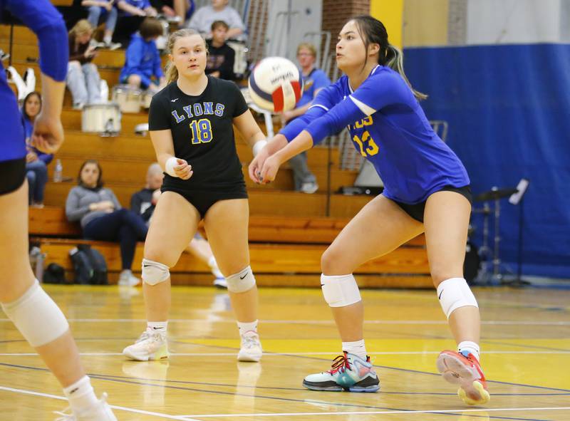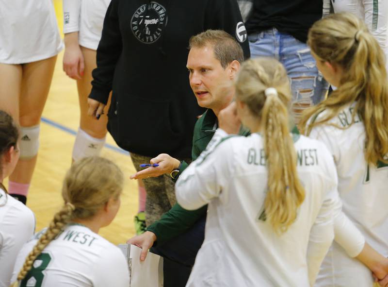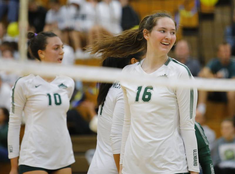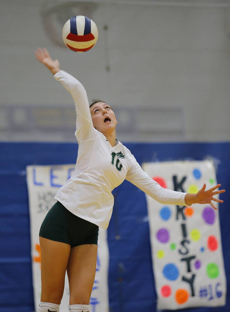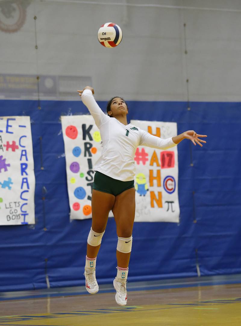 Glenbard West's Marin Johnson (10) spikes the ball across the net during the girls varsity volleyball game between Lyons Township and Glenbard West on Tuesday, Oct. 11, 2022 in LaGrange, IL. (Tony Gadomski/Tony Gadomski for Shaw Local)