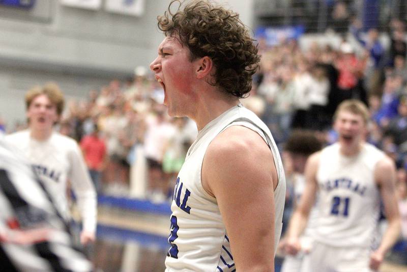 Burlington Central’s Nicholas Gouriotis howls with delight after drawing a foul against Rockford Boylan in IHSA Class 3A Sectional action at Burlington Central High School Wednesday night. (Patrick Kunzer)