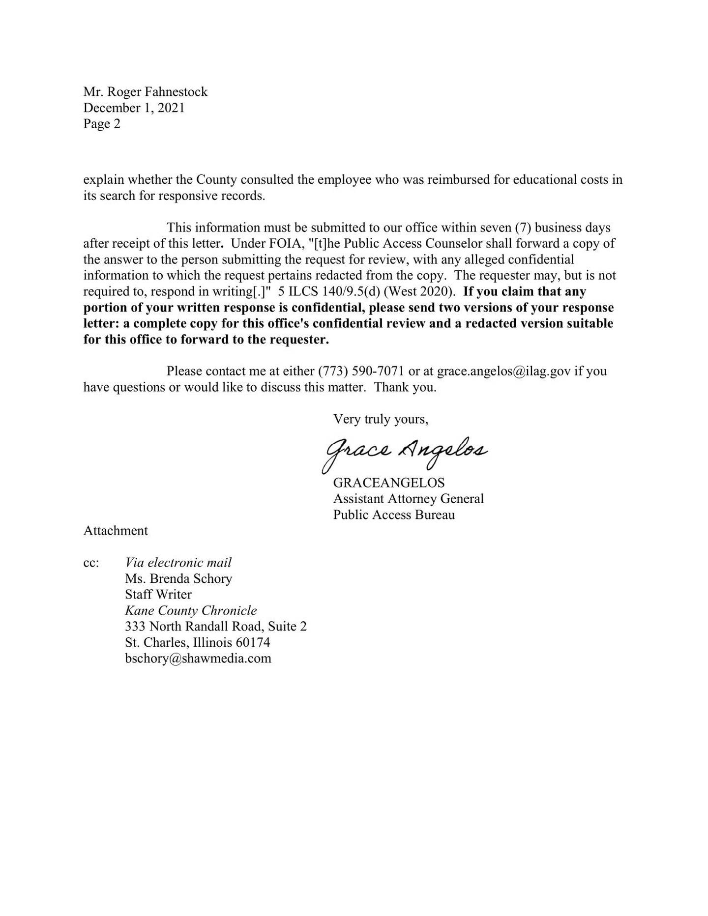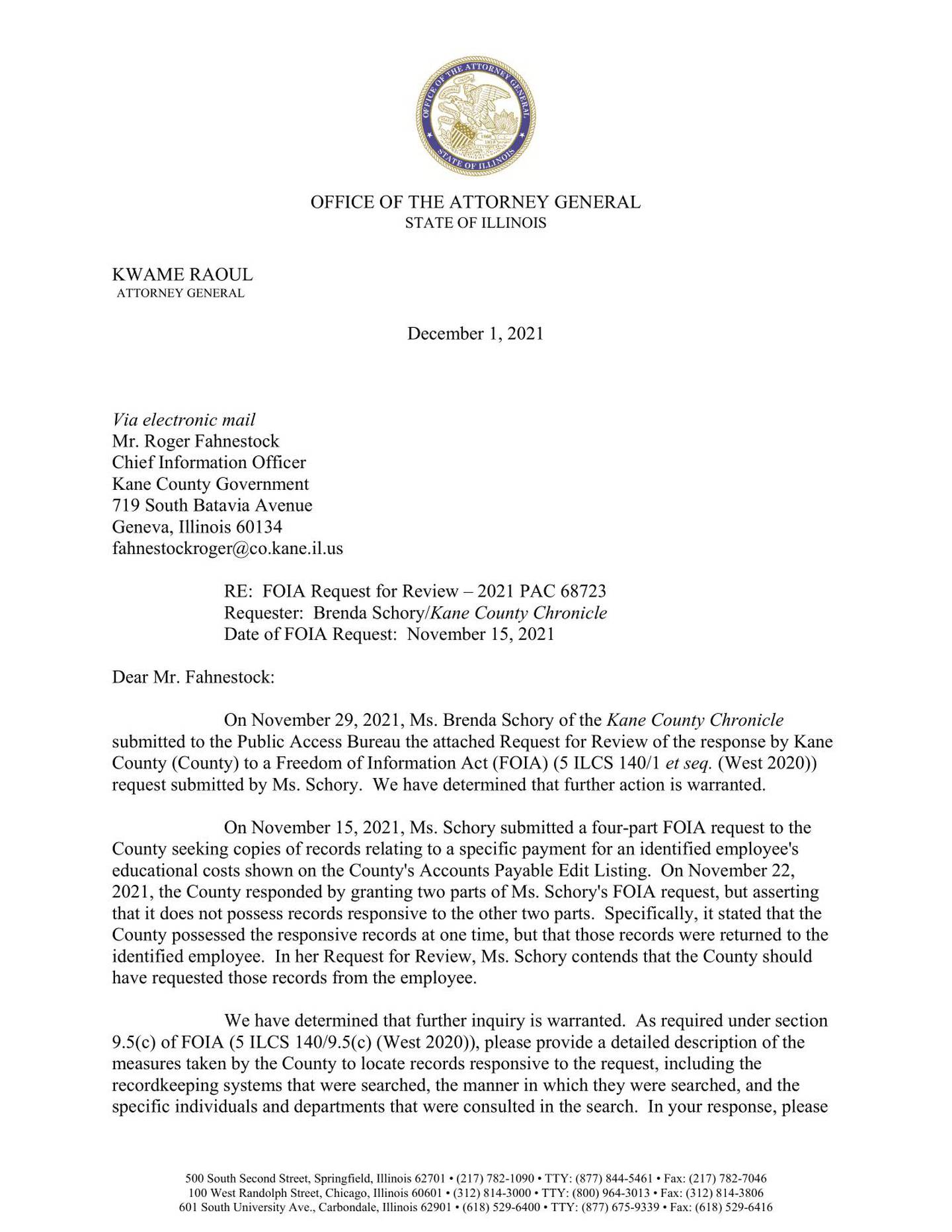 The Kane County Chronicle requested a review from the Public Access Counselor, asserting that according to state law, the records sought are still public and could be provided by the employee, who still works for the county.