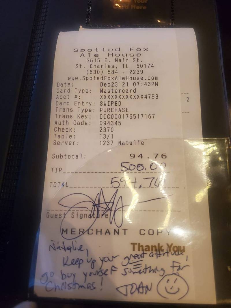 John Hoffman, owner of Whyrent Real Estate Co. in Batavia, appreciated the attitude that Pacheco displayed when she was waiting on his table Thursday. Along with the tip, he wrote a note on the receipt telling her to keep up her great attitude and to buy herself something for Christmas.