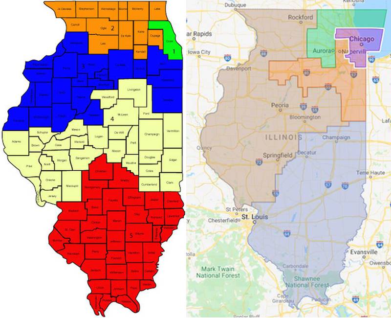 The 5th District, which currently spans more than 30 counties downstate, would gain Champaign County and Macon County, which were previously within the 4th District.