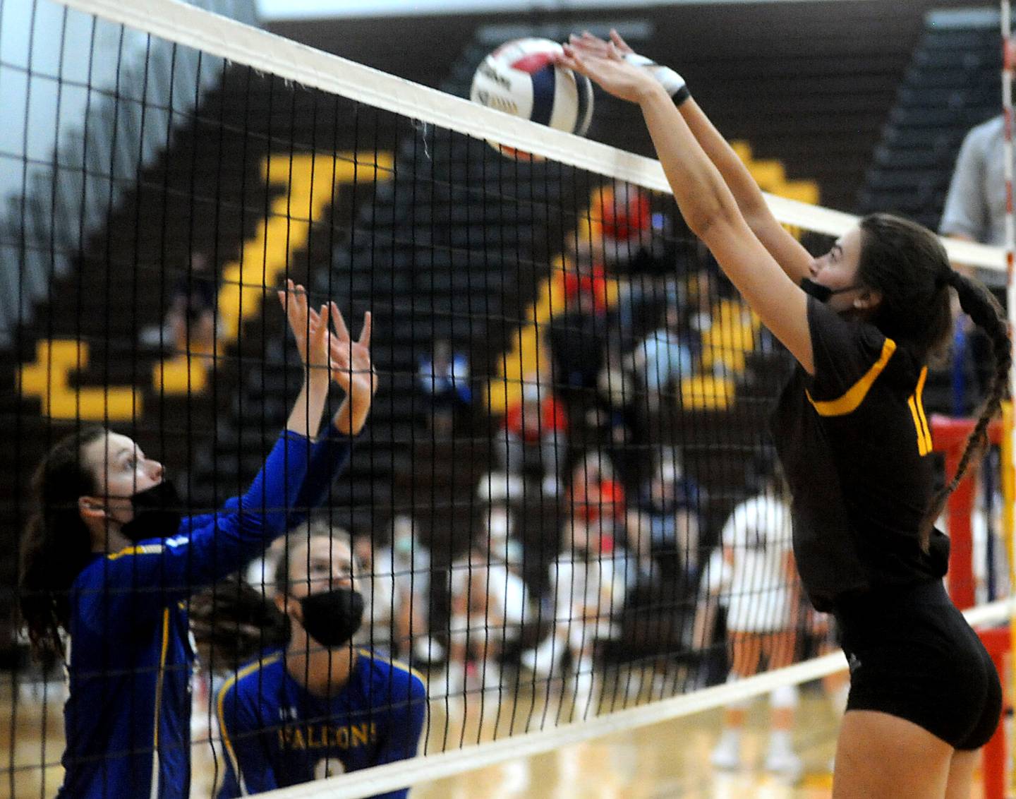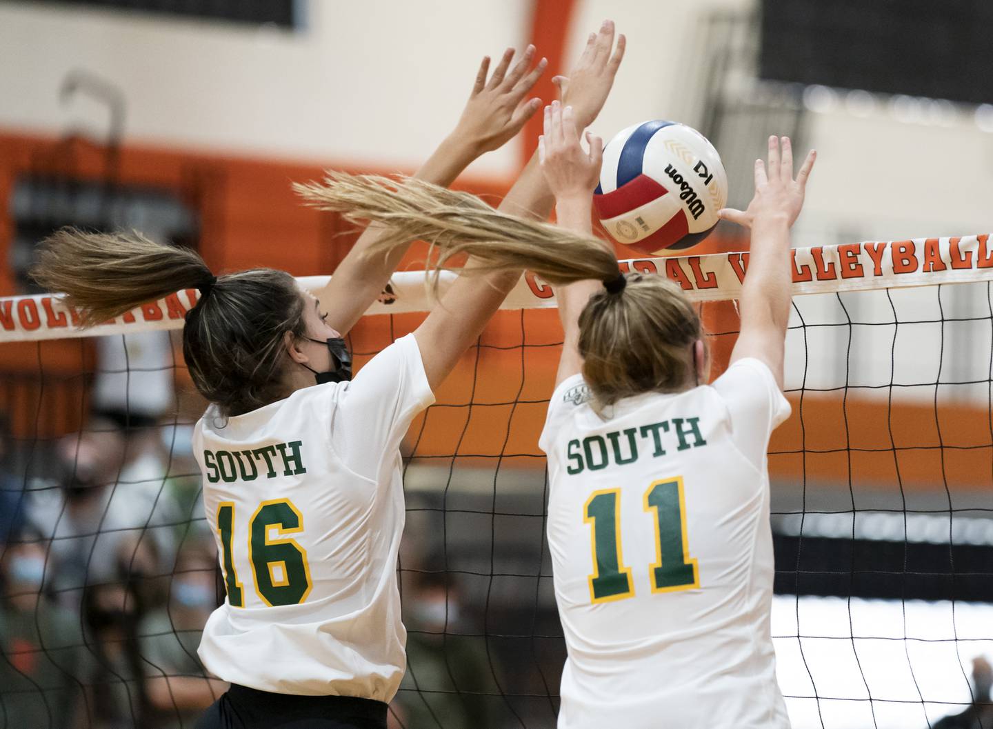 Crystal Lake Central vs. Crystal Lake South Girls Volleyball Crystal Lake South's Megan Langdon (left) and Ashley Ciezadlo make a block against Crystal Lake Central on Sept. 9 in Crystal Lake. (Ryan Rayburn for Shaw Local/Ryan Rayburn for Shaw Local)