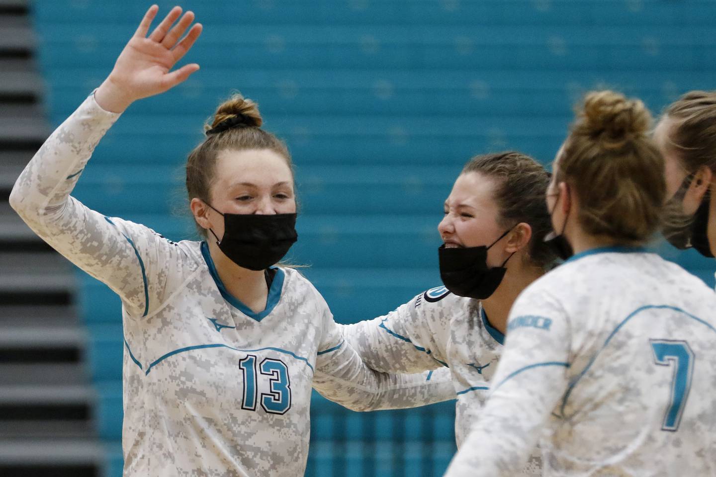 Woodstock North's Kamryn Butenschoen (left) is met by celebrating teammates after scoring a point against McHenry on Aug. 23 in Woodstock. (Matthew Apgar - mapgar@shawmedia.com/Matthew Apgar)