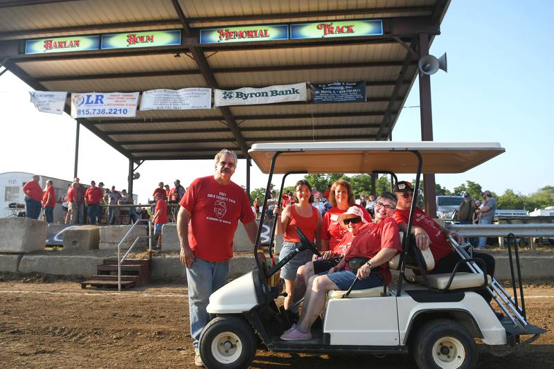 Holm’s family, including his wife, daughter, mother, and brother all wore red T-shirts on Thursday when they were called to the front of the grandstand stage before the start of the tractor and truck pull.