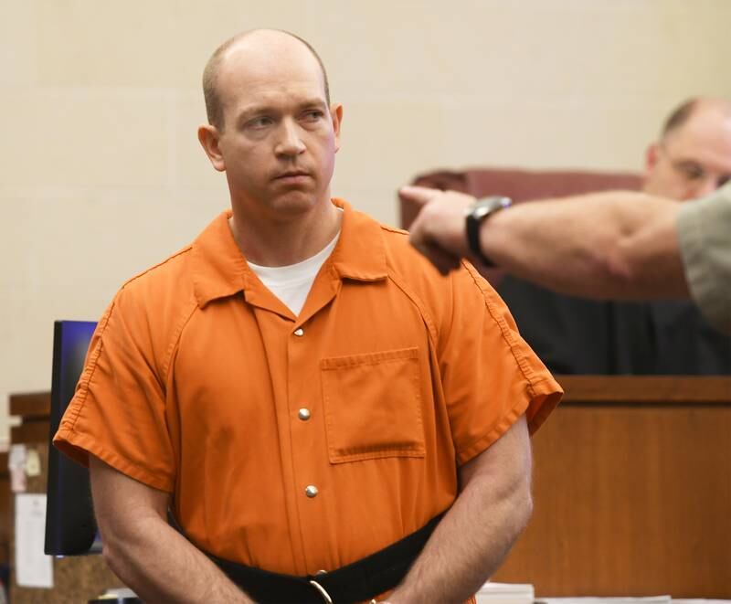 In custody at the Ogle County Correctional Center since his March 8 arrest, Plote appeared in court wearing the standard orange jumpsuit and in handcuffs and leg irons.
