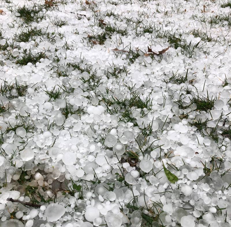 The large hail — measuring close to 2 inches in diameter in some instances — hit the area at around 12:15 p.m. and lasted for approximately 4 minutes, stripping bark from tree branches, denting cars, and overflowing gutter systems on homes.