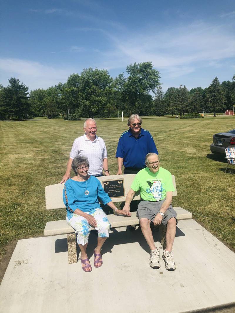 ROCK FALLS – Representatives of the Coloma Township Park District and members of both the Akridge and Wolens families gathered at the Centennial Park tennis courts in Rock Falls to dedicate two memorial benches in honor of the two families. The benches are west of the courts.