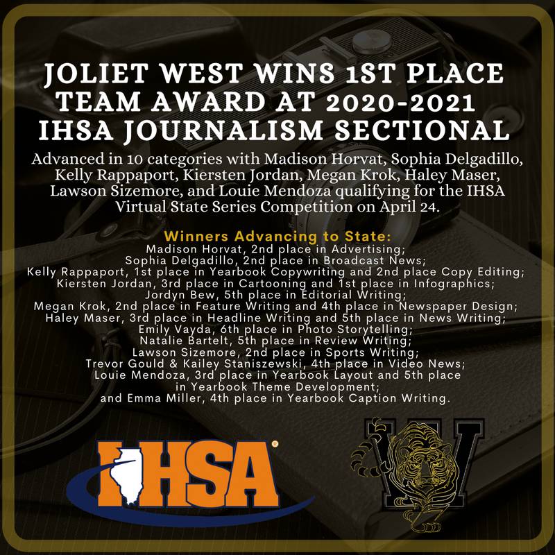 Joliet West High School journalists took home a first place win in the team award category at the IHSA Journalism Sectionals on April 10, which was held virtually this year. Joliet West then advanced in 10 categories, according to a news release from Joliet Township High School District 204.