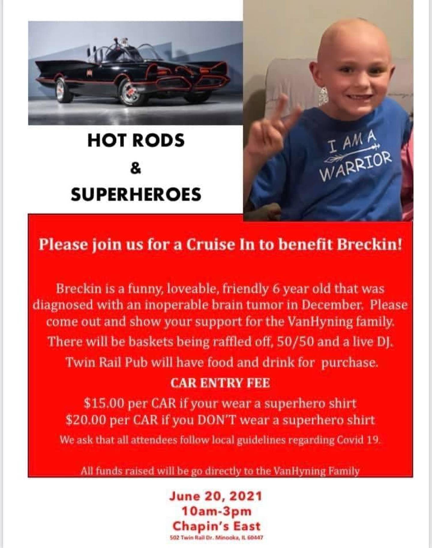 ETC: Raffles baskets, 50/50, DJ. Food and drink available for purchase at Twin Rail Pub. Proceeds benefit Breckin VanHyning’s family.