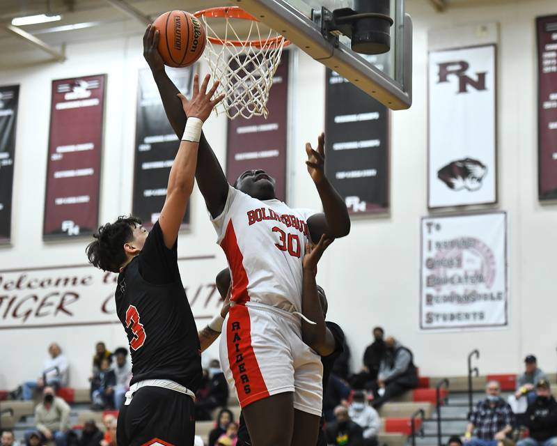 The offensive spigot was almost never shut off for Bolingbrook, but it didn’t have a double-digit scorer until Osei-Bonsu dropped in his ninth and 10th points midway through the third quarter. Daniel Walker joined him a few minutes later and led the Raiders with 12 points, but at times every player on the floor had between six and 10 points for Bolingbrook.
