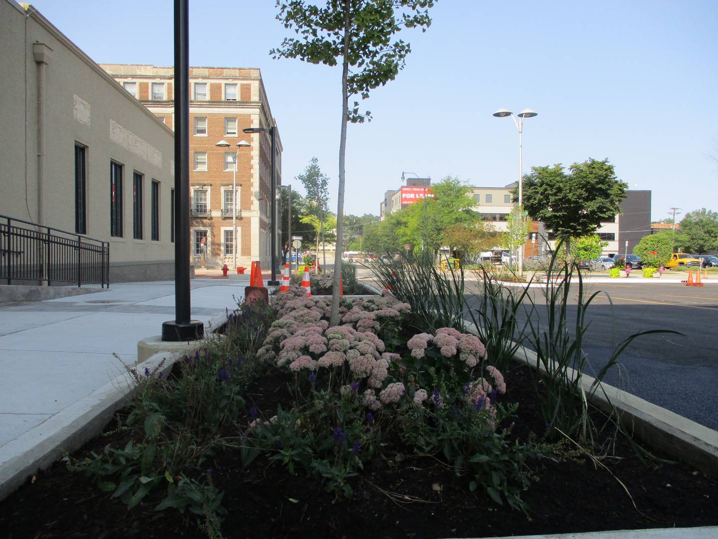 A downtown plaza on the north end of the downtown campus building contains 14 plant basins with a variety of perennials and trees designed to survive the rigors of urban living.