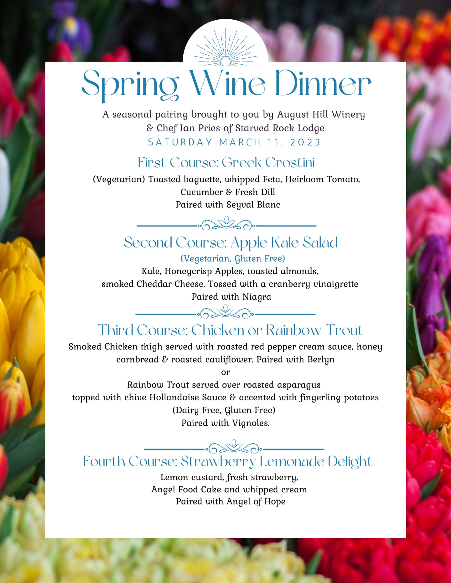The fourth and final course will tempt with a delicious dessert called Strawberry Lemon Delight. It’s prepared with lemon custard, fresh strawberry, angel food cake and whipped cream. The treat will be paired with August Hill Winery’s Angel of Hope, a light sweet bubbly wine made from their Niagara wine with a touch of red wine for a unique pink color. Perfect for pairing with light foods and desserts, Angel of Hope took home a Double Gold Medal and Best of Class award at the 2021 Illinois State Fair Wine Competition.